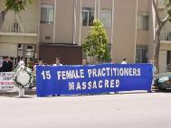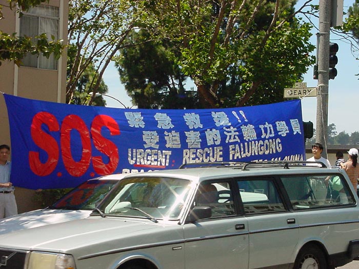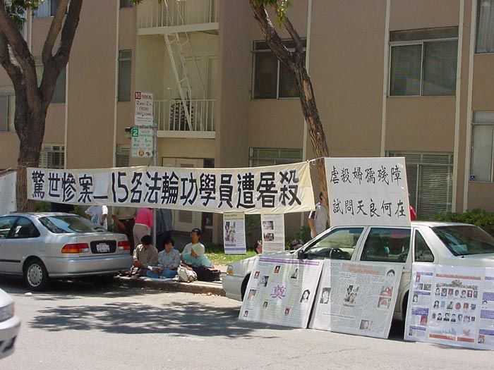 惊闻黑龙江哈尔滨市万家劳教所15名大法弟子被致死的噩耗,旧金山湾区100多名法轮功学员和支持者7月3日下午顶着烈日在中国领事馆前请愿并召开新闻发布会,强烈抗议江泽民流氓集团的迫害,要求立即停止镇压。学员们呼吁媒体对此惨案进行调查,并呼吁社会各界紧急救援在中国的法轮功学员。学员在给领事馆的一封信中说:江泽民一夥出于一己之私,不惜损害国家和民族利益,对成千上万的法轮功学员进行法西斯的惨无人道的迫害,再一次把中华民族推向灾难的边缘。作为中国政府在海外的代表,我们在此呼吁你们转达海外华人对万家劳教所惨案的严重关注和强烈愤慨。在二十一世纪的今天,在中国大地上居然还在上演这种为贯彻独裁者一人意志而肆无忌惮地残害无辜人民的一幕,这是中国的耻辱,所有中国人的耻辱!我们强烈呼吁总领事先生向中国政府转达我们的如下要求:“严惩万家劳教所杀人凶手,停止对法轮功学员的迫害,释放所有被关押的法轮功学员”!