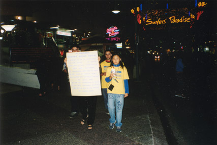 心怀“真善忍”,展开SOS行动,傍晚我们大法弟子都穿上印有“中国停止镇压法轮功”字样的黄色T-shirt,分成两人一组在Carvill Mall 派发中英文传张,报导被迫害致死的大法弟子的人数、大法弟子被迫害实况及呼吁释放被非法关押的大法弟子。不少路人边看传单边摇头叹息。