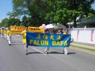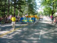 伴随动人的普渡济世音乐,在灿烂的阳光下,彩车开路,我们的游行开始了。虽然我们的前后队伍都有高音喇叭鸣叫,却吸引了观众对我们祥和队伍的注意。由于我们在游行前已散发大量真象传单,当一些观众看到“法轮大法”,“真,善,忍”的横幅时,使劲鼓掌,有的还翘起大拇指。面带微笑,我们向人们招手,衷心祝福小城知道大法真象的善良人们。