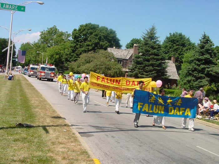就在我们等待出发的时候,这家报社的一位记者看到我们的黄T恤主动来采访。我们及时讲清法轮功学员被残酷迫害的真实情况,解释什么是法轮大法,并给了他大法资料。他告诉我们他回去后要仔细阅读并写出真实的报道大法的文章明天发表。感谢这位记者的善念。更巧的是,不一会香宾另一家报社的主编走上前来和我们打招呼,这位编辑今年一月份经过仔细地调查阅读严肃正面地报道了大法,之后有一些美国人加入了修炼。今天她看到我们壮大的队伍,说,“现在是我写第二篇法轮功故事的时候了。”我们感到天象变化太快了,只要我们用真心做对大法有利的工作,师父就给我们创造条件。现在是记者主动找我们。