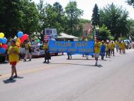 游行是从下午2点开始,不过学员已提前几个小时到了,为的是在游行前把真相传单发给更多的人。在游行队伍中规定不能发材料,但可以在路边发。几位学员专门从游行中抽出来发材料,几里路的游行路线上,这几位学员几乎没停止向热情的观众散发。无法计算发出去多少真相传单!学员们没有豪华的游行彩车,只有简单的几个横幅标语;没有喧闹的队伍,只有黄T恤加上整齐祥和而又庄严的队伍;但观众中不时地给予热烈掌声,竖起大拇指表示他们的敬意和支持。有的观众告诉学员,他们看到了有关法轮功的新闻报导,对中国江泽民政府的镇压实在不可理解,也非常敬佩法轮功学员的精神,祝法轮功好运!