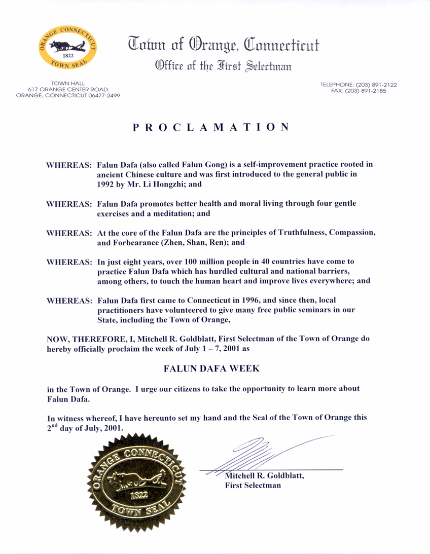 【明慧网2001年7月8日】康涅狄格州桔子镇宣布2001年7月1日至7日为“法轮大法周”。