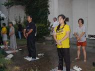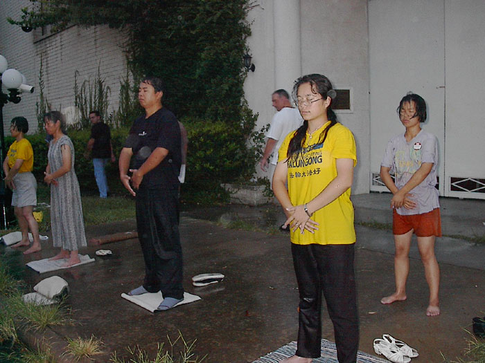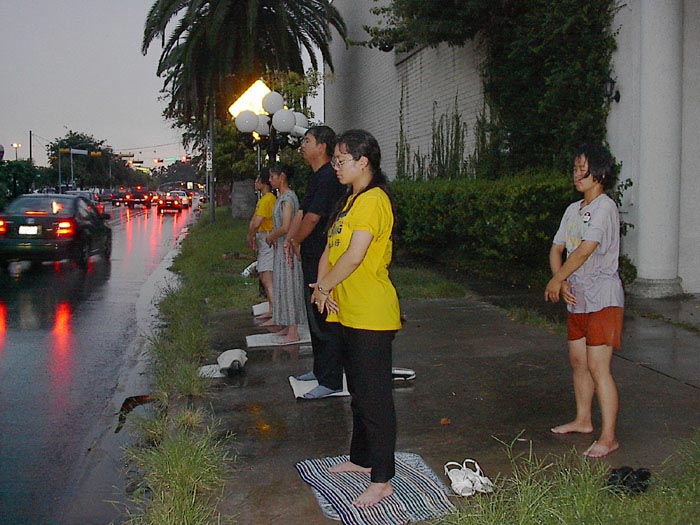 【明慧网2001年8月11日】这是上周四,当休斯顿大法弟子在中领馆前炼功时所拍摄的。发正念后,大家刚开始炼功就下起了倾盆大雨,但大法弟子们丝毫不为所动,坚持到炼功结束。