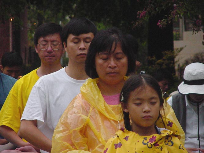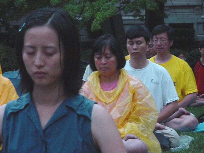 【明慧网2001年8月13日】星期六下午5:00至7:00,正是全球弟子同步发正念的时刻。大华府地区六十余名弟子赶赴中国大使馆前的天安门花园。下午4:20分左右,华盛顿上空突然惊雷滚滚,暴雨如注。弟子们在路上意识到是邪魔对发正念的干扰,当即立掌发正念除恶。许多弟子未带任何雨具,但悟到越是邪魔干扰,条件险恶,越要站到大使馆前。他们不畏风雨,在泥水中盘腿打坐,齐发正念。