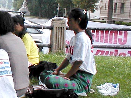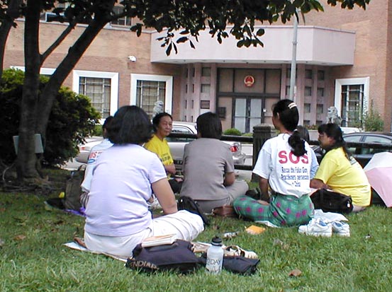 我静坐的第一天开始了。热线电话中不断传来外国及外州的同修们的鼓励。在这个空间虽然我们相距遥远,但另外的时空中,我们肩肩相并。“共同精进,前程光明”。我们不断地学法、炼功、发正念。经过了一场暴雨的洗涤,傍晚天空泛红,真有“天清体透乾坤正”的气势。晚8点时,警车开过,车中警察向我们挥手致意。晚8点45分时,警车再次经过,警察问我们要坐到几点,我平静而祥和地告诉警察,我们要连续静坐263小时。警察笑着问:“那就是说今晚不走了!”我笑着点了点头。警察欣喜地连连点着头说:“OK!OK!”晚10点,警车再次绕着这个小天安门一圈,警察再一次挥手鼓励。晚上11点钟换了个警察走到我们身边。他微笑着问我们要坐到几点离开。我们也微笑着告诉他今晚不走了。他微笑着说:“没问题”。