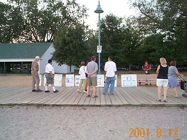 多伦多今年天气炎热,晚上出来纳凉、散步的人很多,这同时也给我们讲清真象、洪法带来了机会,充分利用师父留给我们的每一分钟。于是我们把晚上在家学法、炼功,改在路边、公园和湖边,同时展出我们的展板,把签名册放在一边。我们感觉在安大略湖畔效果最好,几乎所有路过的人都看展板。甚至天黑了,人们依然不肯离去,有的蹲下来,或趴在展板上看。