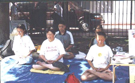 一名13岁的小弟子欧欧,也于一个星期前加入了静坐的行列。天性淘气的他平时炼功不太专心,而来到中领馆前静坐后,整个发生了变化。每天他和老弟子小同修们一起学法炼功,发正念,心性在提高着,他表示会向其他同修一样,坚持在中领馆前静坐到8月31日。他还写了一首诗题为“正念”。