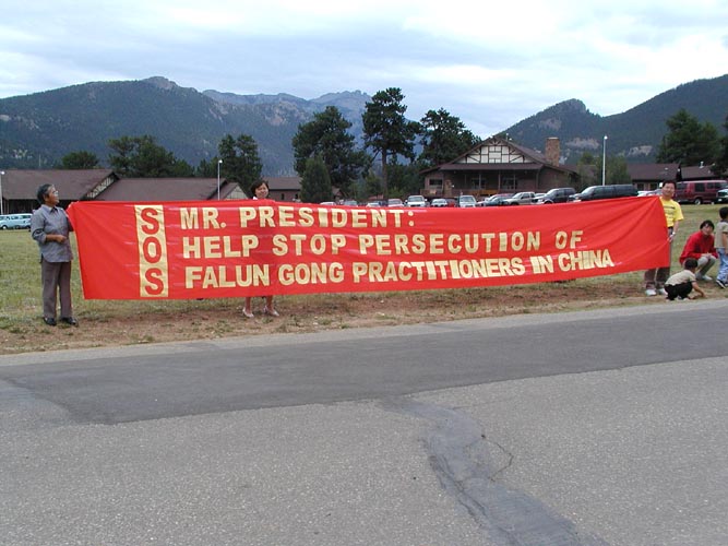 “SOS:总统先生,请帮助制止对中国法轮功修炼者的迫害!”当这幅红色的长二十英尺的特大横幅在布什总统即将来到的基督教青年联合会的广场上打出时,顿时引起了来来往往的人们的注意。在横幅的旁边,随着祥和的炼功音乐,几位功友在演示着功法,其中还有两位分别为四岁和六岁的小功友。刚刚打开横幅不到两分钟,一位记者就走过来采访了我们。我们向他介绍了什么是法轮功以及法轮功修炼者在中国大陆遭受的迫害,并告诉他,我们来这里是促请布什总统帮助那些在中国无辜受迫害的善良修炼者,希望在他十月份赴中国访问时,呼吁江政府立即停止对法轮功修炼者的迫害。