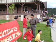 随后,我们回到公园小镇中心的麦当劳吃午饭。快吃完时,我们发现马路两边的人在聚集。原来,布什总统回丹佛去时还会从此经过。慈悲的师父又给了我们一次机会。大家赶紧收起午饭,跑到马路边再一次拉起了我们的横幅,再一次把一张张传单发到了人们手中。我们的横幅又一次成了众人瞩目的焦点。不久总统车队再次从横幅前驶过,总统黑色坐车中前排一人从车内向我们挥手致意。