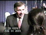 不久那位弟子又见到本州的联邦众议员汤姆.坦利多。这位议员对法轮功非常支持。弟子向他挥手致意,他马上从讲台上走下来与她交谈。弟子对于汤姆两年来对法轮功的支持以及最近联合署名发起支持法轮功的国会188决议表示了衷心的感谢并谈了今天参加晚宴的目的。交谈至最后,弟子请他将资料和信转交给布什总统。汤姆郑重地接过并表示一定帮忙。