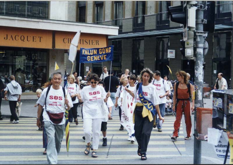 | 瑞士法轮功学员穿过日内瓦闹市区 | ||