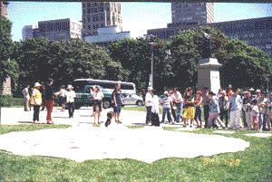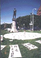 多伦多大法弟子在安大略省省政府草坪前,在人潮如涌的安大略湖畔,向世人讲清真相,并向人们展示了长裙 。几天来,无论我们出现在那里,在我们的周围都会聚集着众多关注的目光和急切的询问,人们难以相信在中国竟会发生这样残酷的事实,许多人问我们,法轮功是什么,中国为什么镇压你们。我们的学员指着身穿白色长裙平静祥和的女大法弟子,和在周围炼功的学员,告诉人们法轮功学员修炼这种舒展祥和的五套功法,同时他们按照“真善忍”的原则作好人,他们追求着美好的精神境界。两年前的中国,有上亿的法轮功修炼者,他们通过修炼获得了身心的受益。然而,中国大陆掌握专政大权的几个邪恶却对这样的善良民众进行了惨无人道的血腥镇压。