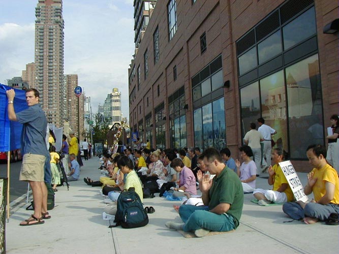 【明慧网2001年8月20日】为了进一步呼吁紧急救援中国大陆被的法轮功学员,特别是危在旦夕的130名被非法关押在马三家劳教所的学员,纽约地区的法轮功学员8月18日下午4点,在纽约市的中国领事馆前开始了130小时的静坐请愿。18日下午,近二百名来自纽约,新泽西州和宾州的学员陆续来到领馆前炼功和发正念,声援参加静坐活动的学员。这一静坐活动将延续到8月24日早晨,另有个别学员则将静坐265小时,以悼念被江泽民政府残酷迫害致死的265位法轮功学员。