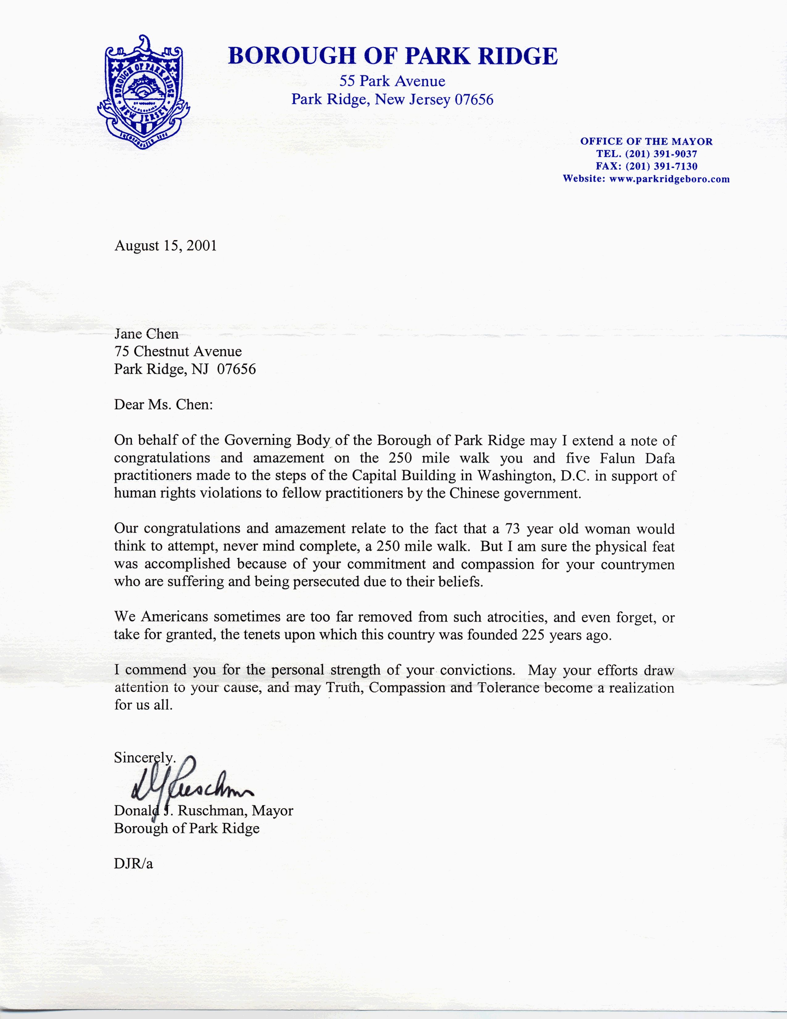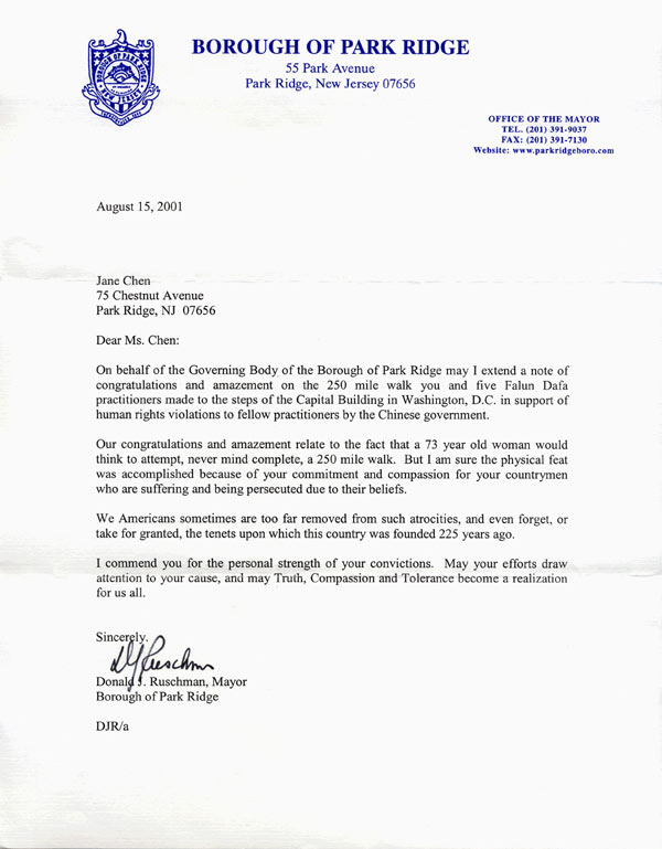 【明慧网2001年8月21日】在信中,Park Ridge市长Donald Ruschman表达对73岁的步行者的敬佩。他说这样的高龄不要说走完250英里路,连想要参与的念头都值得敬佩。信中对SOS步行者的善良和奉献高度赞扬,并希望步行者的努力能引起世人关注。最后希望真、善、忍在我们所有人中实现。