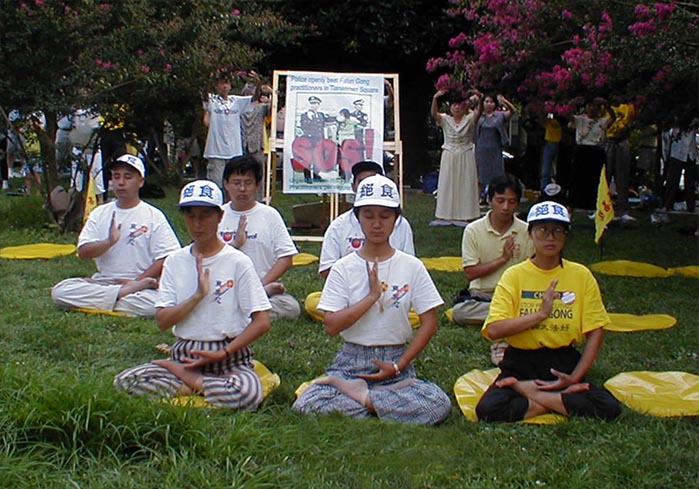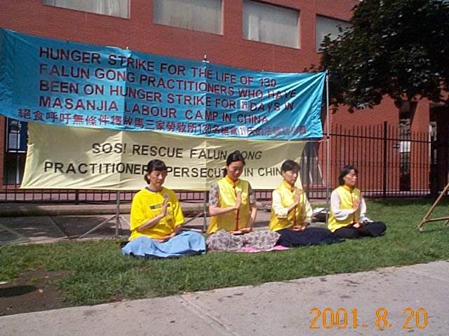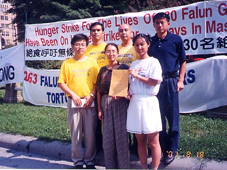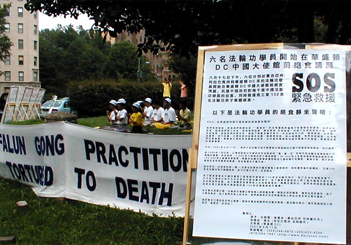 <英文版: http://www.clearwisdom.net/emh/articles/2001/8/16/12965.html>绝食进入第四天,10位美国大法弟子中使馆前召开新闻发布会