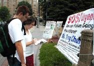 【明慧网2001年8月21日】昨天我们向路人的紧急呼吁开场白已经全部换成了更加急迫的内容:“对不起,请稍留步,今天已是(大陆法轮功学员)第十七天绝食了,非常紧急需要您的签字,请给予道义上的支持。130个生命正在危机中,中国江泽民政府不答复,非常残酷、非常紧急”……于是,给德国总理的加急救援信就这样一封一封地被路人接过去了。一会刚复印的三百份就见底儿了,出乎一位学员事先的意料。这位学员认为,前天已有500人签了,都是老面孔了,人家都反问:你不认识我了吗?我已签了。于是她感觉不用主动上前再问了。但是我发现这与马三家的紧急现状反差太大。师父给我们一次次机会,我们不能再一次次推开。我们一定要牢牢把握住国内学员通过巨大的承受而带来的机会,必须掌握向世人呼吁的主动权。我们都有希望“一劳永逸”的惰性,其实这已经被魔钻了两年的空子。毕竟周末有很多新面孔路过,这么大的行人流量绝对还有可救之人没有接触到。这种不顾一切的呼吁词让世人那麻木的心深深触动,感到了十万火急。试想如果我话都说到这份儿上了,那路人再不急不动心,那他的良知和善念位置已是明摆着的了,那他该去哪里。我们明白人不说清紧急程度那是我们对路人、对每个生命不负责任。那些路人听明白了后愿不愿意签,那才是他们自己的选择。我们一定要说明、点透,一定要给足其机会。