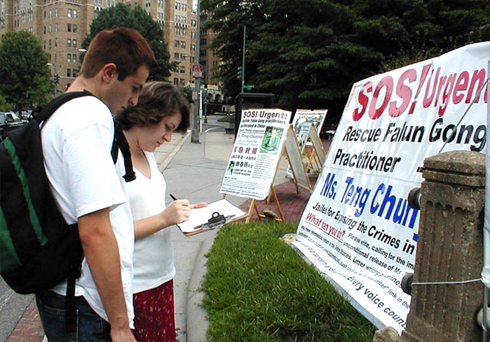 “法轮功学员在中国驻美大使馆前的和平请愿已达近两年,然而使馆官员一次又一次把我们的和平请愿信拒之门外。为了生命的正义良知,我们特此呼吁中国大使馆向它自己的公民敞开和平对话的大门,你我同为炎黄子孙,至少应该对人民的生命有着最起码的同情和尊重。”