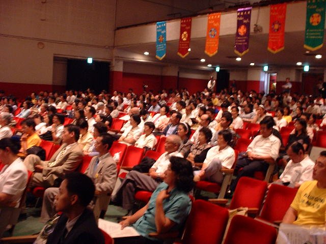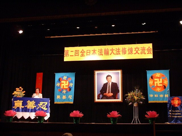 【明慧网2001年8月21日】8月19日天气晴朗,风和日丽。那天,日本第二届法轮大法心得交流会在东京都丰岛区公会堂举行。在日本时间早上6、 7、8点进行了周日的三次固定时间发正念活动之后,法会在9:30准时开始。会场正中悬挂着师尊的照片,两边是“法轮常转”、“佛法无边”的旗帜。