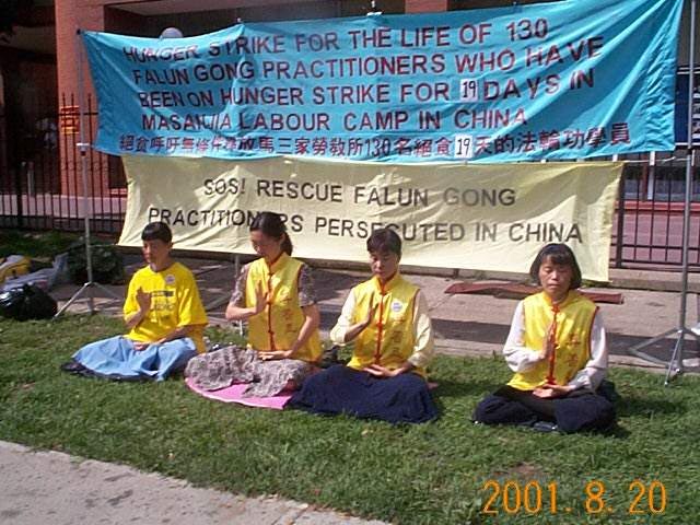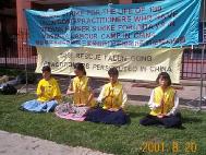 【明慧网2001年8月21日】 为纪念在过去两年邪恶镇压中失去生命的大法弟子,唤醒所有善良的人们共同起来反对这场历史上最黑暗残酷的镇压,旧金山大法弟子于美西时间8月19日中午12点开始在中领馆前持续263小时静坐。