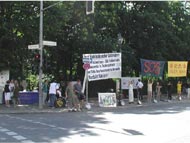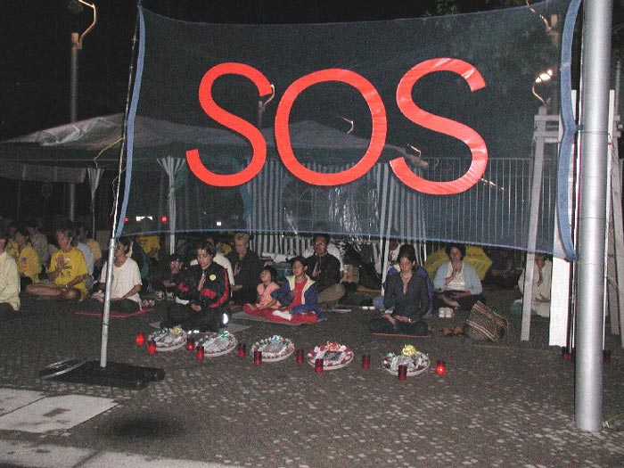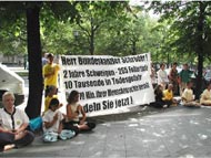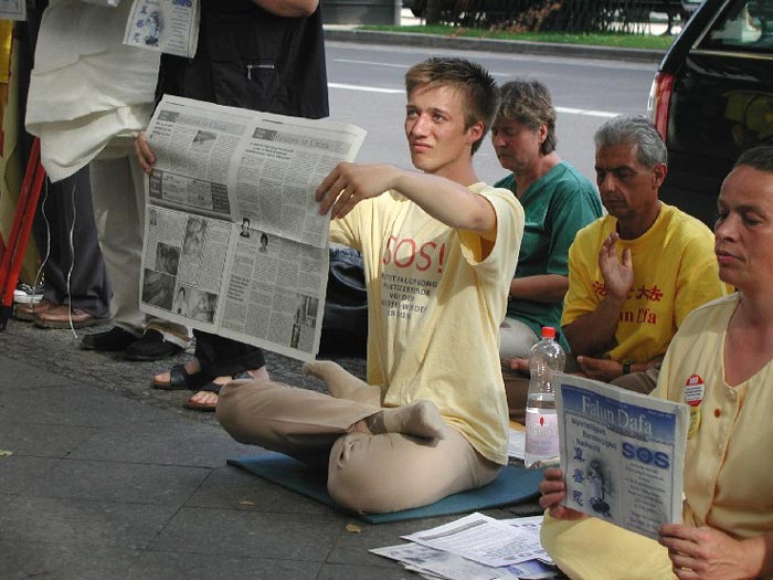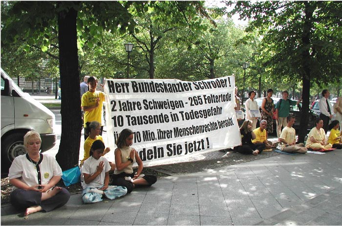 那天,学员们一早就挂好了大横幅“SOS”,“法轮大法”,“紧急救援,刻不容缓”及各种呼吁停止屠杀的横幅。其中的一副引起众多的行人注目:“施莱德总理:已经沉默两年了,268人已死,7百万人被镇压,请立即采取措施!”帝国大厦参观的游人络绎不绝。看到学员紧急呼吁的情景与和平炼功场面,纷纷拍照,索要资料。他们对江政府的暴力行径感到十分震惊,并在向德国总理呼吁书上签字。