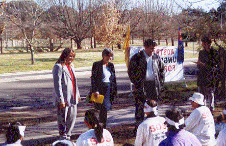 上述三位立法委员和坎培拉法轮功联系人,西人弟子克拉克、2名绝食大法弟子代表及1名坎培拉弟子前往对面中国驻澳大使馆递交绝食抗议公开信。克拉克按门铃很长时间,对讲机才有回音:“干什麽?”一个女工作人员问。