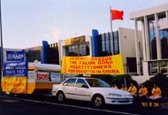 下午,天气一直阴沉沉的,风也越刮越猛,时而还夹着雨。但是,学员们迎风而坐,单手立掌,正念除恶。在正与邪的较量中,学员们决心用自己的承受,强烈要求江泽民政府停止对所有法轮功学员的迫害,唤醒更多的世人站出来支持正义。