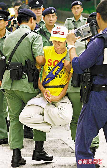 九女一男的法轮功学员昨日上午九时许抵达西区中联办大楼正门外静坐绝食,要求关注在内地劳教所绝食超过三星期的法轮功成员。开始时在场警员并没有阻拦。但至下午一时许,在西区警署指挥官率领下,在场大批警员(约80人)突然采取行动,两三名警员联合抬一人,逐一将十名请愿者抬上警车带走。其间,法轮功学员并无反抗。绝食请愿者被带返西区警署后,被登记个人资料,至傍晚全部获释,但警方表示会进一步研究是否检控该十名法轮功成员。