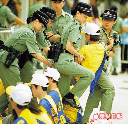 | 警员抬走在中联办外练功示威的法轮功学员。(美联社) | 女警出动抬走部分参加示威的法轮功女学员。(美联社) |