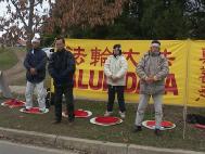 上午,一辆中国游客巴士专门将车开到我们这边,并在“法轮大法”大横幅前停下,车上游客都能清楚看到真相展板和所有大型横幅,旅游巴士停留良久,才沿着横幅和真相展板前缓缓驰去。是啊,这里已不失为大陆游客的珍奇景观。
