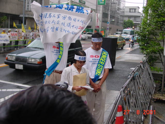 8月27日下午2时,4名学员带着信和标语准备给大使递交请愿信和资料。突然开始下雨了,大使馆的工作人员告诉门警,不准让他们进入。他们告诉门警,中国人有权利进入自己国家的使馆,但没有用。雨突然下大了,递信的学员瞬间被淋湿了,但他们打开了信,大声朗读起来。有两家电视台记者将这动人的历史的一幕记载下来了。只听到一名女学员流着泪大声说,“法轮功学员修炼真善忍,有什么罪?270名学员被残酷虐杀,现在又有130名学员生命危在旦夕,我们上访请愿是宪法赋予的权利。”无论如何请求,仍是不准入内。