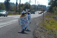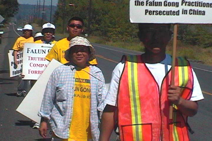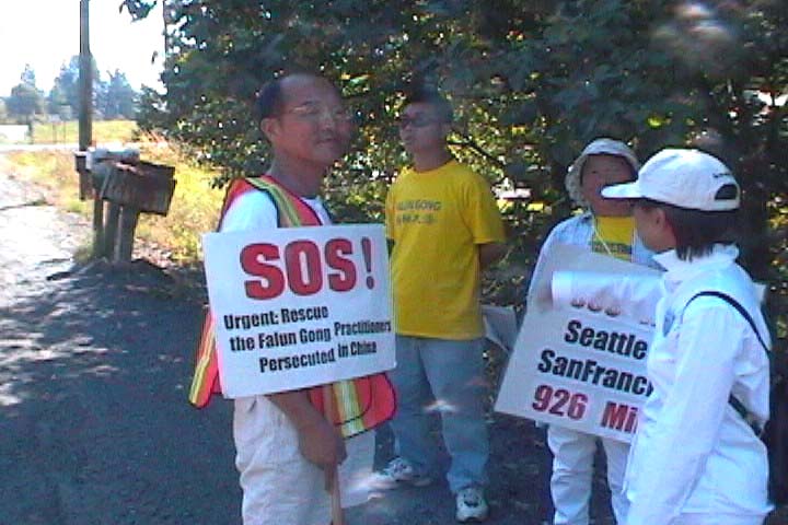 “今天是出发的第一天,我已经开始怀疑自己能不能走到华盛顿去了。我曾听到这样一个故事:一位在中国大陆的法轮功修炼者唐先生,为了法轮功和平上访,从他的家乡走了1000英里到北京,他穿着草鞋,沿路乞讨,只用了25天。