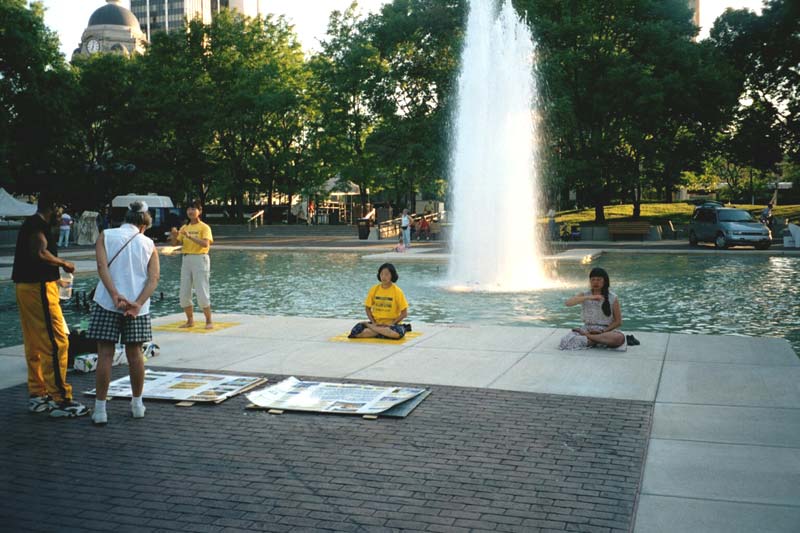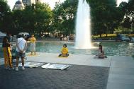 在市中心的四方泉广场,学员用高音喇叭向市民介绍了法轮功和在中国的镇压,身着白装的学员集体演示了功法,许多市民驻足观看。一位父亲一边看一边对他的孩子解释,这并没有错,却在中国被禁止了,所以他们要表示抗议。一对四、五岁的双胞胎男孩从头到尾观看了我们的活动。当地三家大报都派出记者跟踪采访了整个游行活动,详细记录了学员的公开演讲。当我们刚在广场上站定后不久,就开始下雨,许多学员在心里默发正念,几分钟后,雨渐停,云散尽蓝天又现,一上午都未露面的太阳散射出灿烂的光芒。