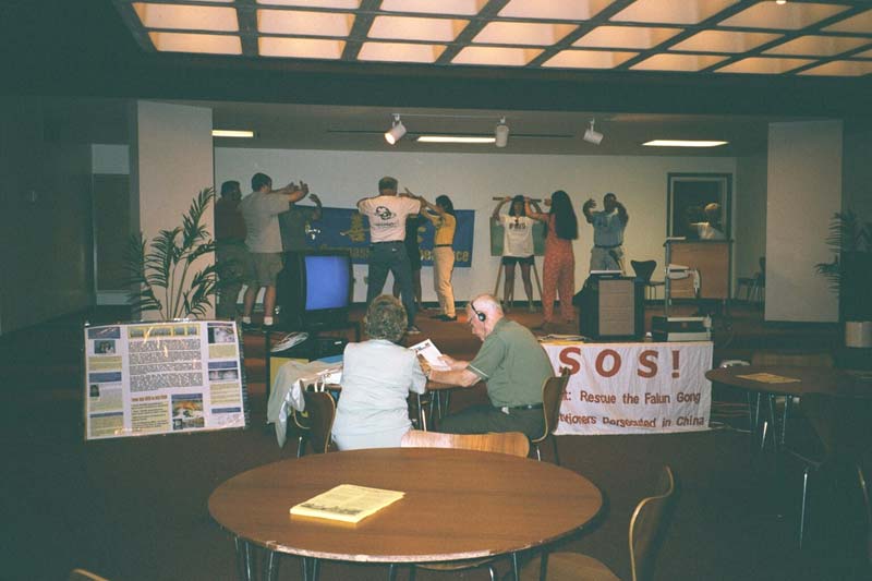 在举办讲座时,通常是由一个学员用投影片作简短的介绍,然后给大家看8分钟介绍法轮大法的录像。接下来是教功,因为大家学完第二套功比较累,我们就稍做休息,给大家放讲清真相的录像。参加讲座的人看到法轮功学员在中国被迫害的画面,大多都流下了眼泪,纷纷签名,有的还要捐款。学完五套功法,很多人要买书和教功带。他们中也有人一直在找这部法的。