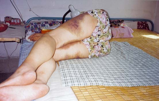 走一段被追上来的恶警拦住,翻出横幅,我继续喊:法轮大法好!我坚决不配合邪恶,几个恶警连拉带拽,鞋也被拖掉了,袜子也磨破了,脚后跟被磨出血,裤子也被磨了个洞,就这样我被他们强行拖上警车,在车里它们怕我喊,一个恶警踩着我后背,不让我抬起头来。到了天安门分局,我揭露他们打善良的好人,它们不敢承认。后来他们说:听你的口音是唐山的。我不配合它们,就这样他们误认为我是唐山人,就被带到唐山驻京办事处。他们问我姓名、住址,我拒绝回答,他们让我好好想想,说:你不说我们有的是办法。几分钟后,他们继续问,我还是不回答,心想:决不能让他们邪恶得逞。邪恶终于露出狰狞的嘴脸,一个40多岁的男恶警手里拿着胶皮棒,抡起就打,累得满头大汗,还气急败坏地说:“还没见过你这样的,真是骨头!”又换了一个恶警……我时刻默念师父正法口诀:“法正乾坤,邪恶全灭。法正天地,现世现报。”我想我不能这样消极承受,念一出,我开始上不来气,邪恶之徒就住手了,一个说拿凉水泼,一个说给口凉水喝,另一个说不行,拿水一泼一会儿就好。就这样他们停止了毒打,把我铐在暖气管子上,我半躺半坐在地上,默念师父正法口诀。