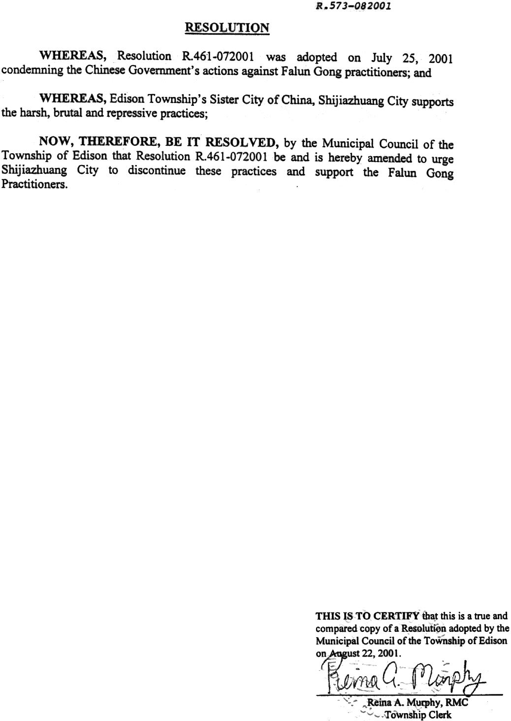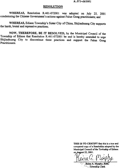 因此,现在,爱迪生市议会通过461-072001号决议的补充决议,敦促石家庄市停止这些镇压行径并支持法轮功修炼者。