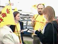 我们站在机场外交通道的出口,向前来采访访问活动的媒体记者们发放了“SOS,法轮功”的报章。有三家大型电视台立即现场采访了我们,给了我们向公众揭露中国当局非法镇压的机会。