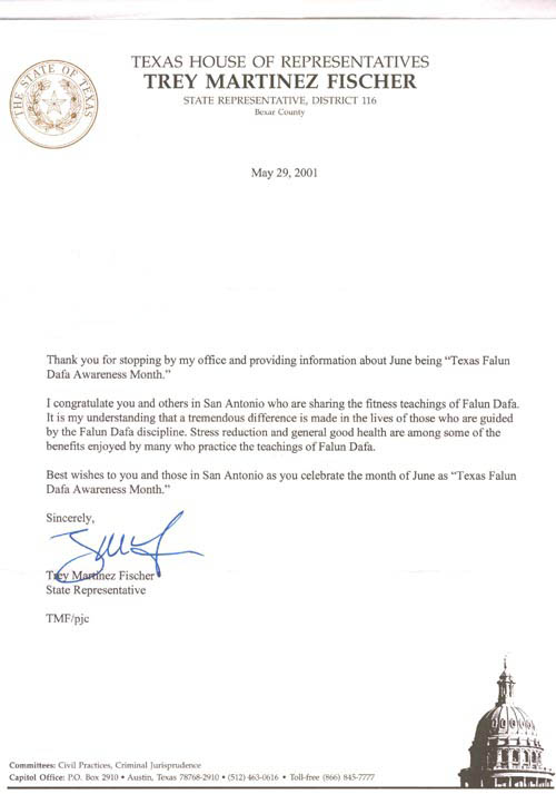 【明慧网2001年9月11日】德克萨斯州州众议员崔·马丁尼兹·福歇尔(Trey Martinez Fischer)祝贺“法轮大法认知月”。