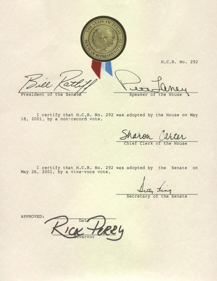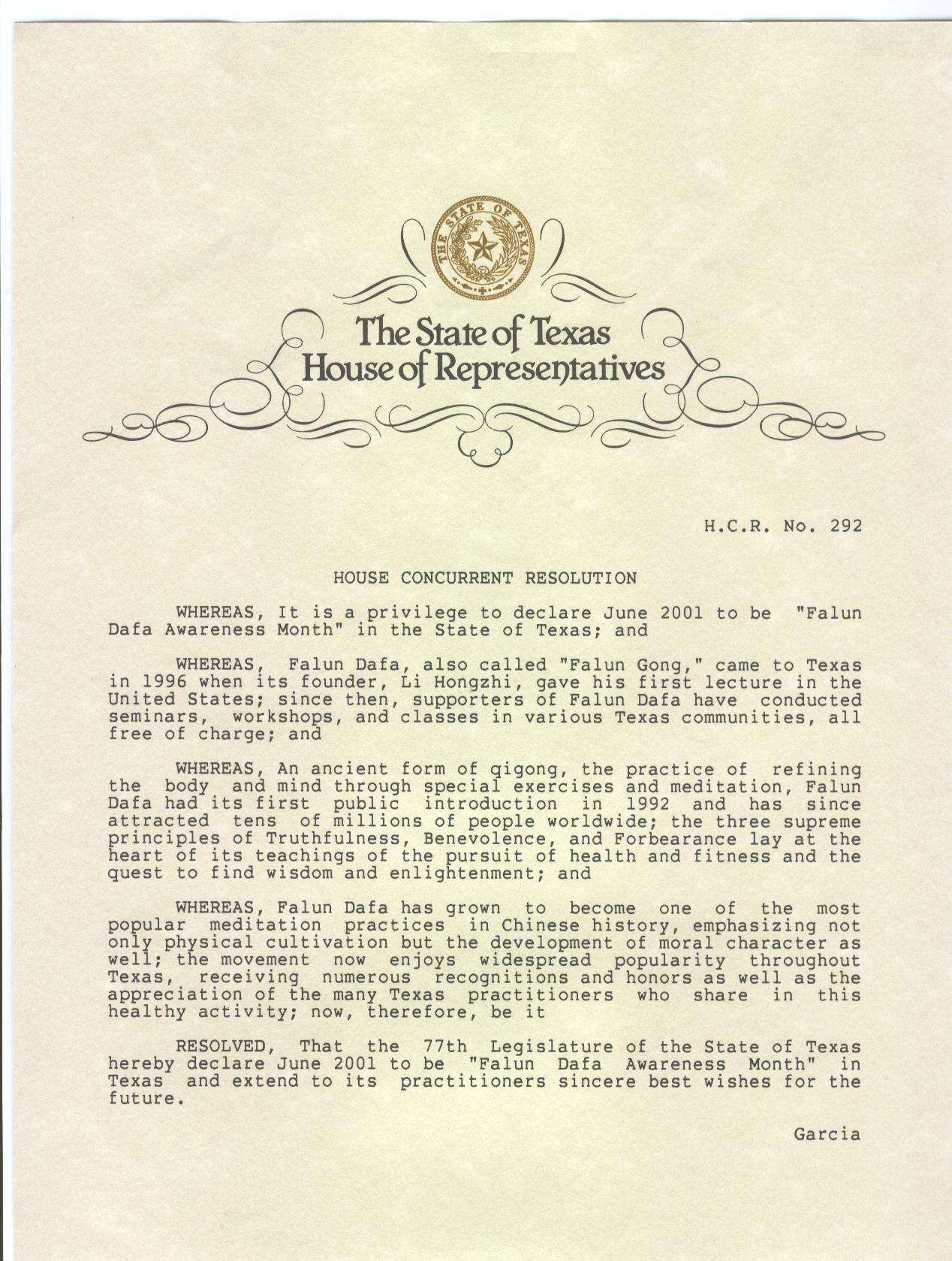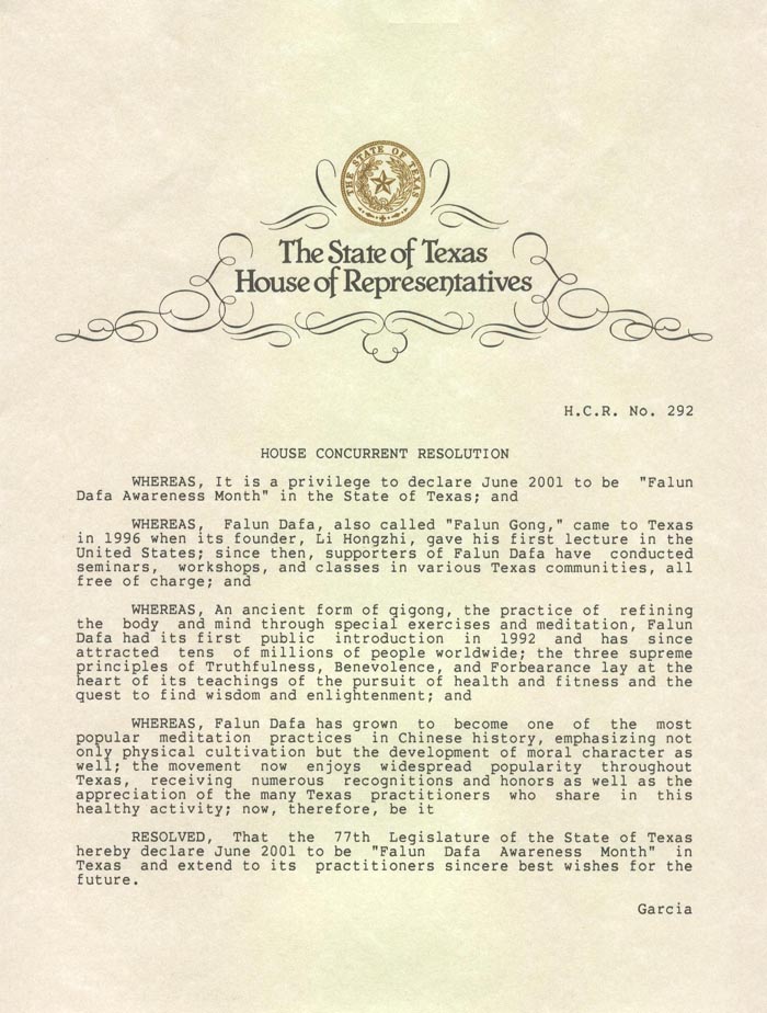 决议如下,得克萨斯州第77届州议会宣布2001年6月为得克萨斯州“法轮大法认知月”并向修炼者的未来致以最美好的祝愿。