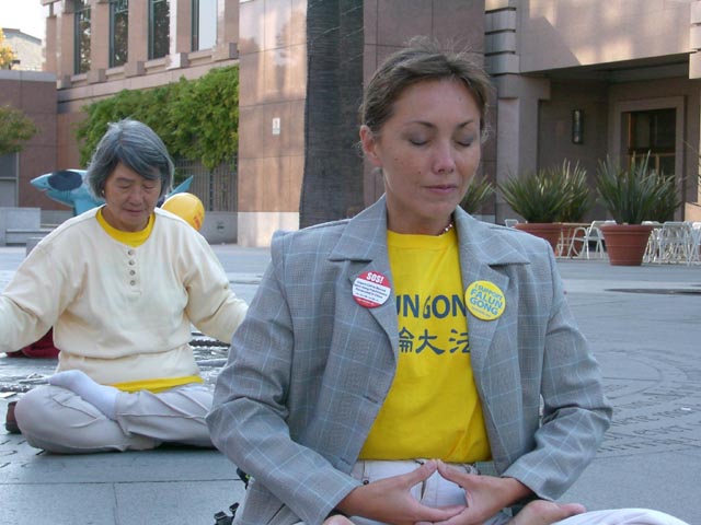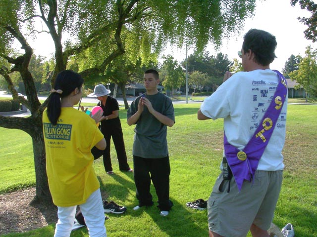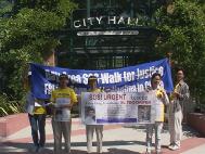 从圣荷西出发的学员在行进中,遇到了一位美国少年。他接过真相传单后上了公共汽车,读了传单后,深受感动,马上在下一站下车,赶上游行队伍,表示要和我们一起步行,并在结束后,在公园里认认真真地学了五套功法,我们都为这位善良的年轻的生命而高兴,就象尊敬的师父所讲的“俩俩相继而来”,有缘的善良的生命,都会被伟大的佛法救度,因为这生命还有回归善良本性的心。通过这次的活动,我们帮助更多的本地居民了解了中国江泽民集团迫害无辜法轮功学员的事实真相。