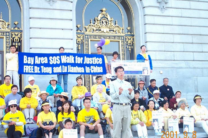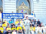 在早上九点钟左右,各地都举办了新闻发布会。在圣荷西的费而蒙特旅馆边的空地上举行的小型的新闻发布会上,几位本地学员分别发言,讲述了自己回中国和平上访被无理关押入狱、遭受中国江泽民政府迫害的亲身经历。学员吕中华则向来采访的媒体介绍了她的姐姐,吕建华,因为回中国后,向群众讲清法轮功受中国江泽民集团污蔑和迫害的事实,而被非法关在辽宁省马三家劳教所至今的情况。