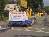 一大早我们就来到了现场,很快就装饰好了彩车。我们排队等着游行的开始,旁边一辆车上坐满了中学生,孩子们对我们打坐很感兴趣,一位学员当场就教给了他们第五套功法。孩子们非常高兴。当该我们进入游行队伍时,孩子们连连挥手向我们道别。