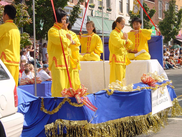 游行车队缓缓向前移动着,我们的彩车前面有三个学员打着一幅法轮大法的大型横幅。彩车上装饰的花、花环使彩车显得格外漂亮。车上的大型横幅上的真、善、忍几个大字特别醒目。气氛庄严而肃穆。来看游行的人非常多,至少有一万人。在近一小时的游行中,有多处为我们做了介绍,观众不时鼓掌,向我们挥手,许多人还念横幅上的字。我们平和优雅的表演给观众留下了深刻的印象。一位美国人说:你们的表演真棒,非常祥和,安静。