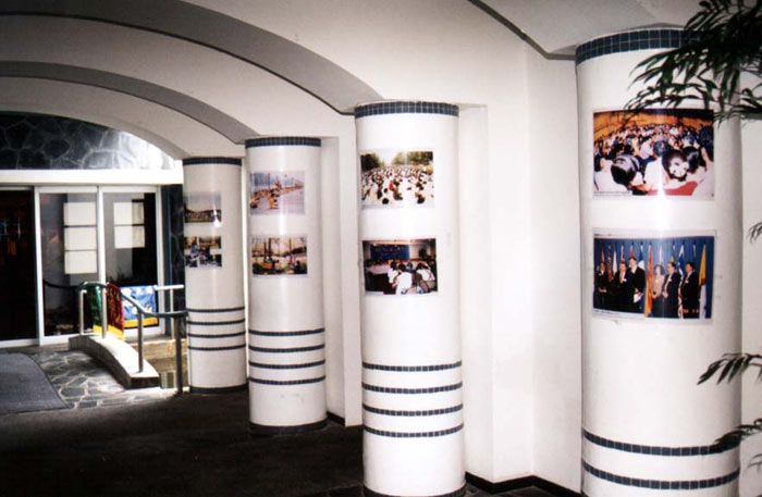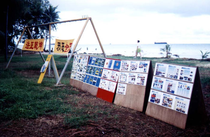 9月9日法会正式举行。上午台湾弟子和塞班岛弟子一齐集体炼功发正念,下午共20多人发言谈心得体会。同时在会场内举办“正法之路”图片展,以及放映放光明电视组制作的《钢琴独奏》和《生命的歌》。感谢台湾弟子带来很多彩旗,把会场布置的庄严肃穆。