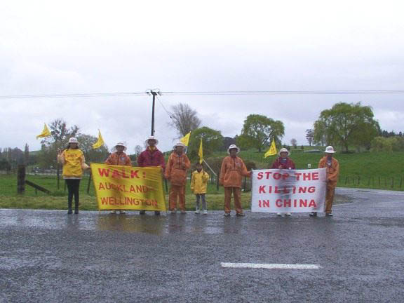 此次参加步行的学员平均年龄在57岁,年纪最大的已经72岁了。今日由剑桥(Cambridge)到泰崂(Tirau)的途中,并有年仅七岁的小弟子也加入了此一神圣的步行运动,在步行当中有许多过往的车子按鸣喇叭向弟子们示意给予鼓励。虽然在风雨中步行,弟子们更加坚定,坚修大法紧随师。