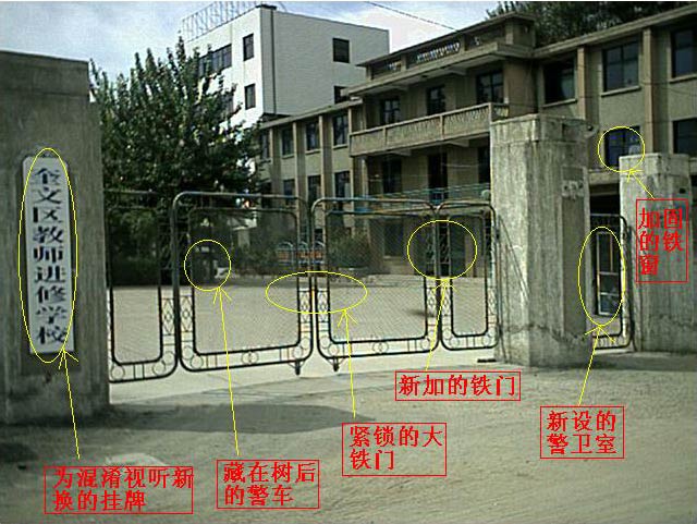 【明慧网2001年9月17日】 潍坊市工业干校(现改名为“奎文区教师进修学校”)从去年就成为残酷、非法关押大法弟子的邪恶之地。2000年10月份开始,对大法弟子进行封闭式强行洗脑,每天高音喇叭里播放着谎言,震耳欲聋,对大法弟子进行精神摧残,不写“保证”不放人,有的关押长达数月。由此“工业干校”这一名称臭名远扬, 为掩人耳目现改名为“奎文区教师进修学校”,现在这里每天大门紧闭,楼道里还增加了铁门(见照片),隐蔽处停放着警车(见照片),关押大法弟子的一、二层楼全部安装了铁窗。大门口原“传达室”现改为“警卫室”。