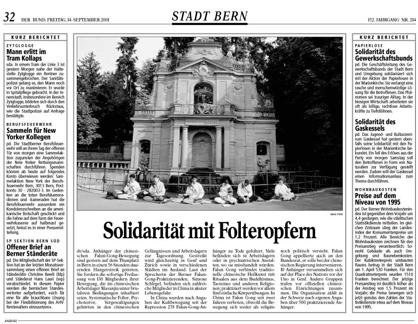 据声称,自从镇压以来已有278位法轮功成员被迫害致死。更多的被关押在劳动教养所或者在精神病医院,在那遭受着非人的待遇。法轮功结合了中国传统的中医,佛教,道教和其他宗教。最主要的是练习5套身体锻炼功法。两年来法轮功在中国被禁止,虽然这个运动既没有宗教色彩也不参与政治。法轮功呼吁联邦政府对中国政府进行干预。10位法轮功追随者聚集在日内瓦的联合国广场前。另外的小组集会在其它的中国办事处前。据法轮功瑞士协会声称,在瑞士将近有500位练习者。