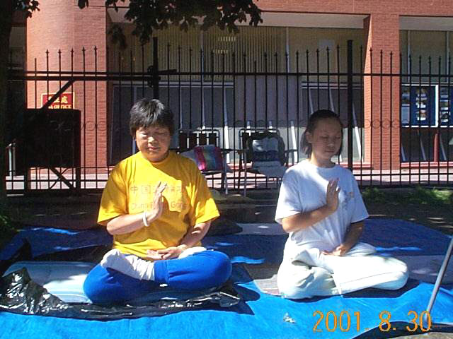多伦多大法弟子自8月20日上午九点开始的绝食声援行动,至今已10天了。在这不同寻常的日日夜夜里,先后有五批多伦多大法弟子参加了绝食行动,他们中有60多岁的老人,有年轻的母亲,有博士和公司的职员。一名西人学员白天不能来,夜晚来到了这里,当晚天气很冷而他只穿了一件短袖衫,同修们递上一件衣服,他穿上后执意要敞开胸,因为系上扣子就会将短袖衫上的大法字样挡住,他说我要让过往的人们都看到。一些同修身在中领馆,心中时时关注着中国大陆同修和世界各国大法弟子的情况,有弟子将明慧的文章下载,给同修们传看。