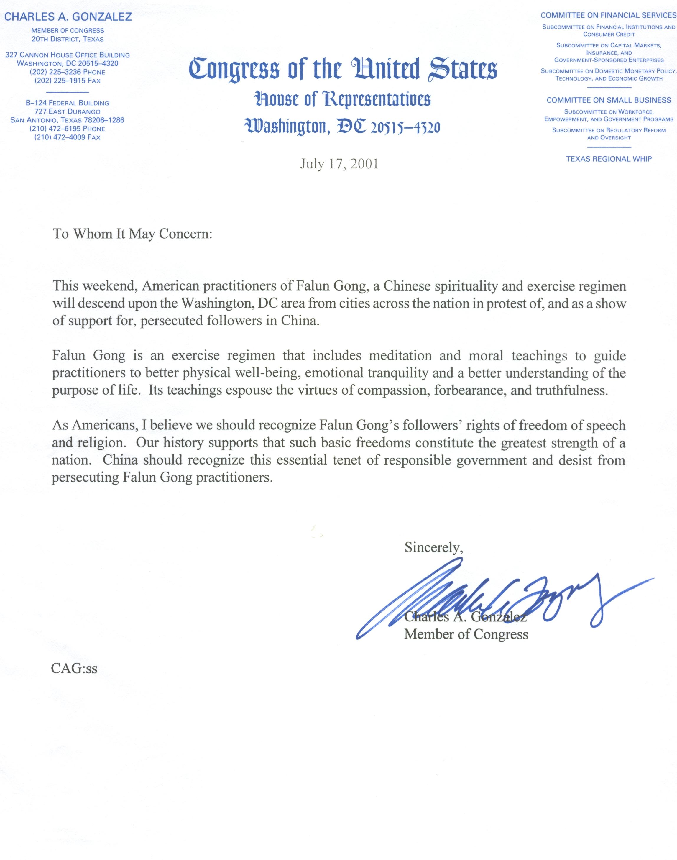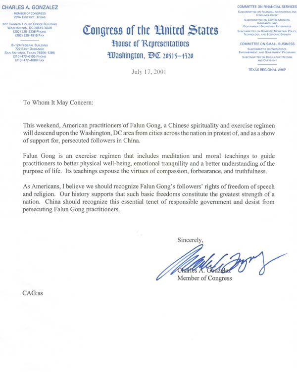 作为美国人民,我相信我们应当认同法轮功修炼者言论和信仰自由的权利。我们的历史表明这些基本的自由组成一个民族最伟大的力量。中国政府应当认同作为负责任的政府必需具备的这种准则,停止迫害法轮功修炼者。