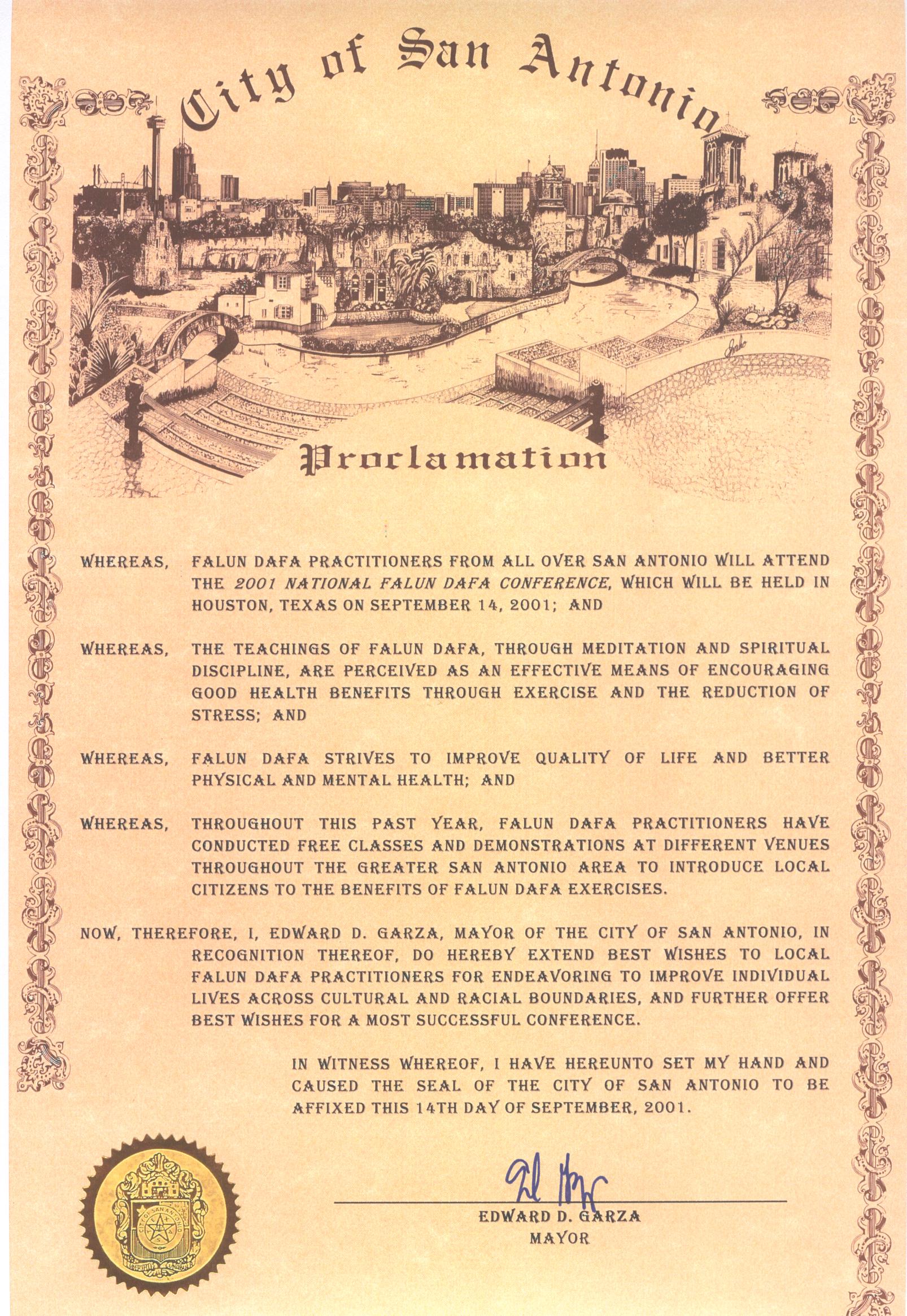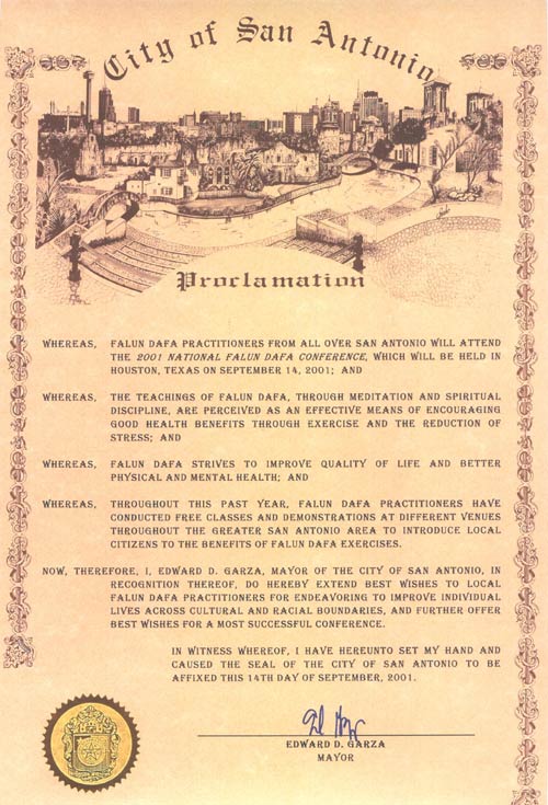鉴于,在过去的一年中,法轮大法的修炼者在大圣安东尼奥地区举办了若干免费的讲座和示范,以向本地居民介绍法轮大法功法的益处,