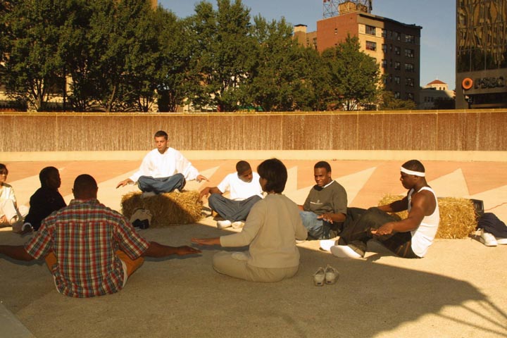 在九月十五日这天,法轮大法学员同时参加了三项活动:健康节,体育活动节和艺术节。由艺术家法轮大法学员设计制作的休息亭摆放在市中心圆形广场的最中央,亭子里铺着手工编制的草垫,亭子四周环绕摆放着供打坐用的草垛。在大法音乐的伴奏下,近二十名学员同时演炼法轮大法的第五套功法,整个场面既祥和又壮观。习惯了都市生活的人们,当意外地看到这片宁静和祥和后,纷纷加入其中……